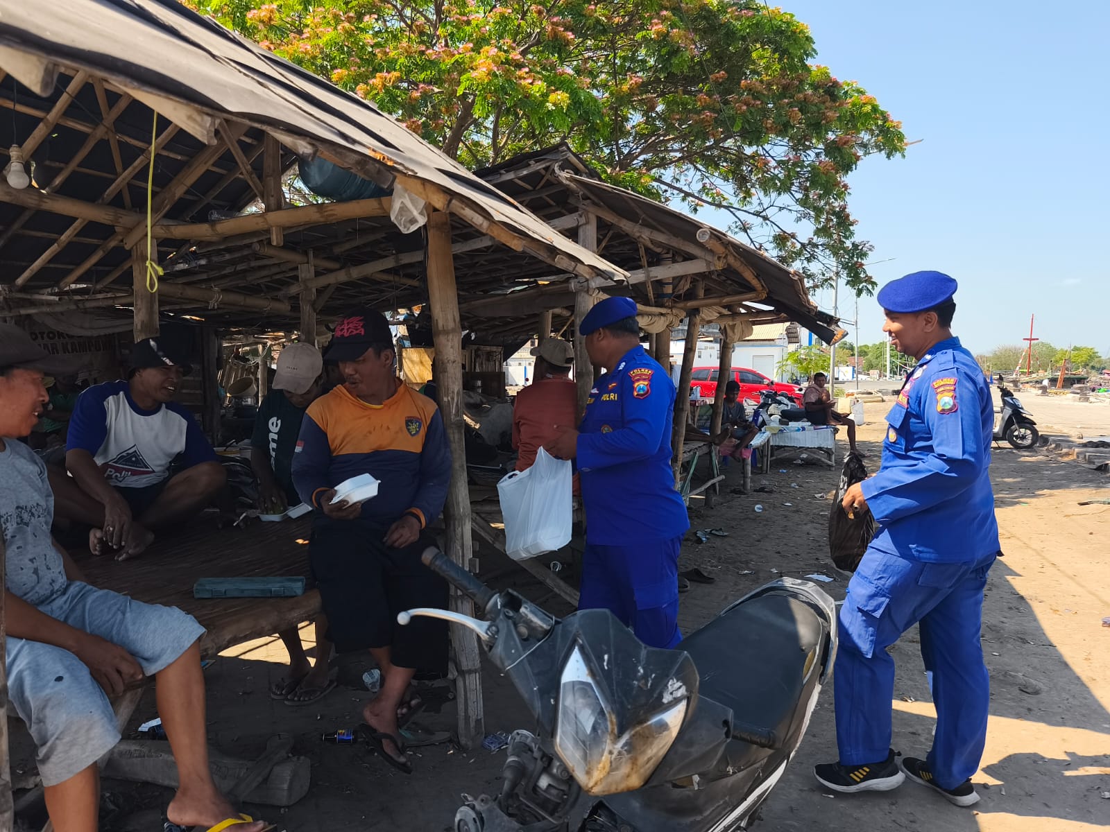 SITUBONDO – Dalam upaya mempererat hubungan dengan masyarakat pesisir, Satpolairud Polres Situbondo Polda Jatim kembali melaksanakan kegiatan sosial bertajuk “Jumat Barokah” dengan membagikan puluhan nasi bungkus kepada nelayan di kawasan Pantai Tanjung Pecinan, Kecamatan Mangaran, Jumat (10/10/2025) pagi.