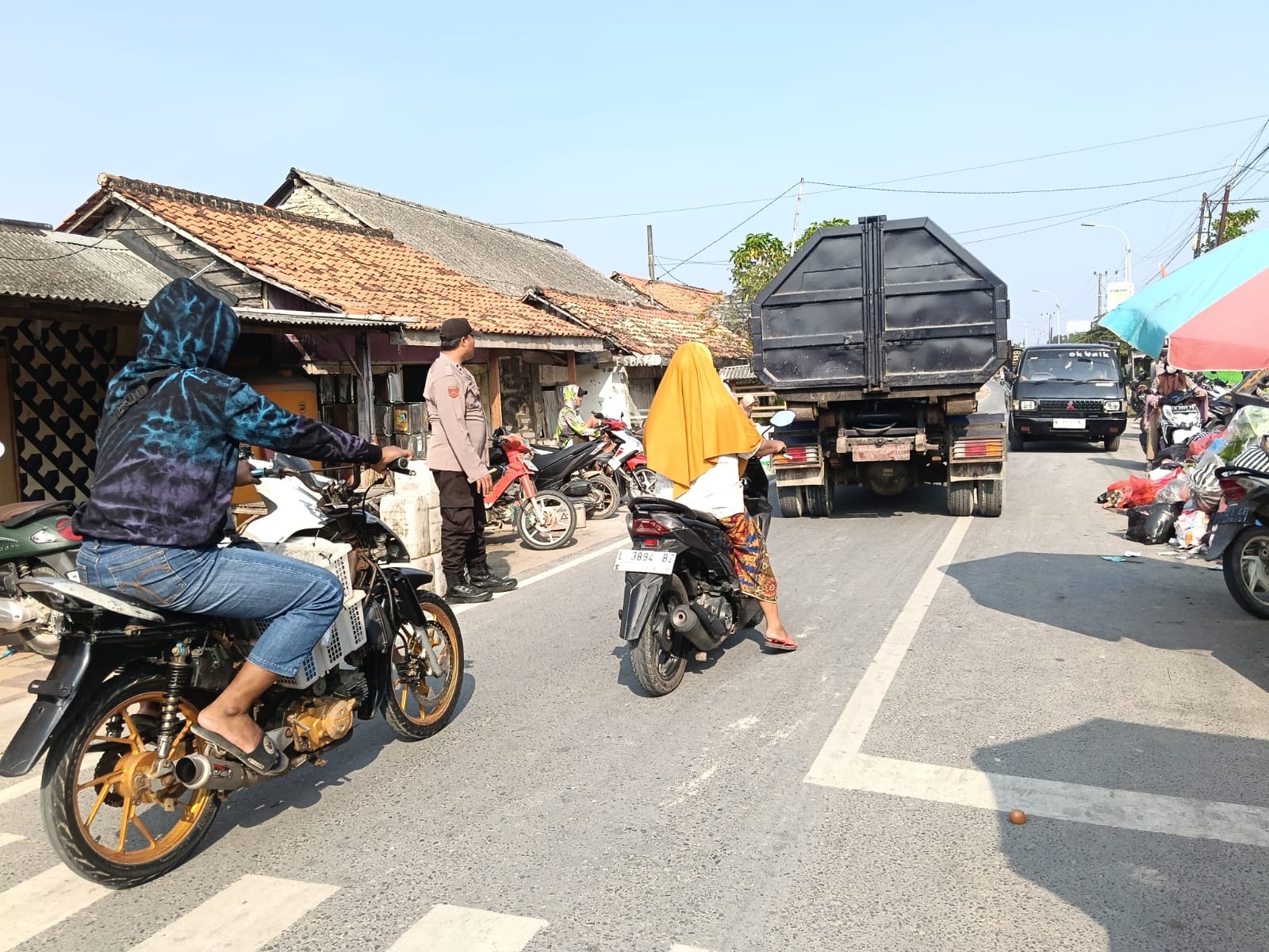 Senin (15/10/2025) anggota Polsek Pengarengan melaksanakan pengamanan dan pengaturan arus lalu lintas di depan Pasar Pengarengan.